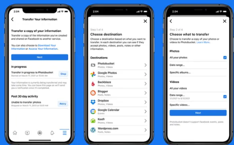 自Facebook 于 2019 年推出该服务以来,传输您的信息已经扩展。Facebook 工具的目标及其与 Microsoft、Google、Twitter 和 Apple共同参与的数据传输项目的目标是让用户无需先下载即可在平台和服务之间传输信息。该项目的成员在其各种专有 API 之间开发“适配器”,例如,Facebook 照片可以毫无混淆地转移到 Google 照片。